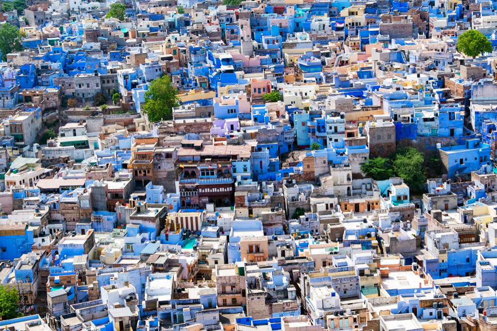 a 36 metri e larghe 20 metri, che ospita al suo interno palazzi reali e templi. Dalla sommità del forte è possibile ammirare il labirinto di vie della “città blu”, colore che indicava un tempo le abitazioni dei sacerdoti della città.